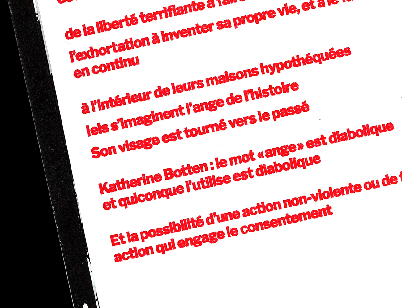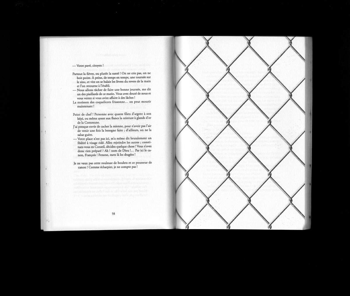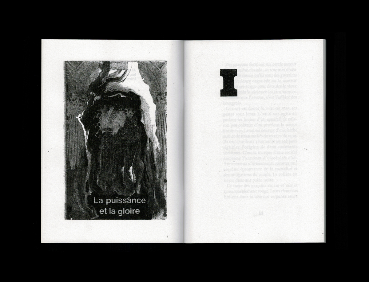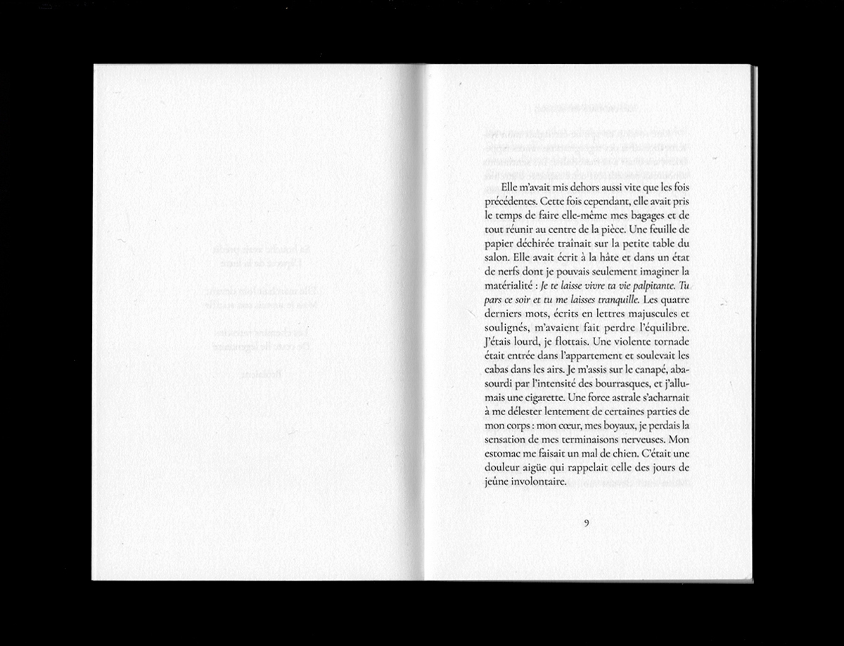 « Des images se superposaient sur différents niveaux, différentes échelles spatiales et temporelles. À chaque fois que j’essayais de m’endormir, tout recommençait. Mon front était incandescent, les gouttes de sueur tombaient en cascade un peu partout sur mon corps décharné, mes yeux pesaient cent kilos et elle m’attendait. C’était une statue, un syndicat, un objectif inaccessible, une fleur. Il me semblait qu’elle me protégeait d’une force plus grande encore, plus sombre aussi, quelque chose de l’ordre d’une attaque du grand capital, un crack boursier ou une bulle financière. Sur un carton publicitaire, sa silhouette prédécoupée dominait une foule attentive. »