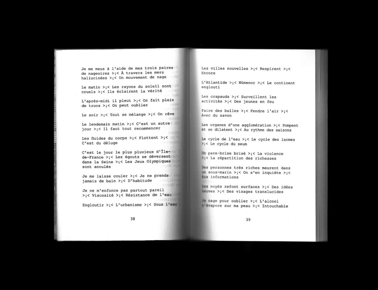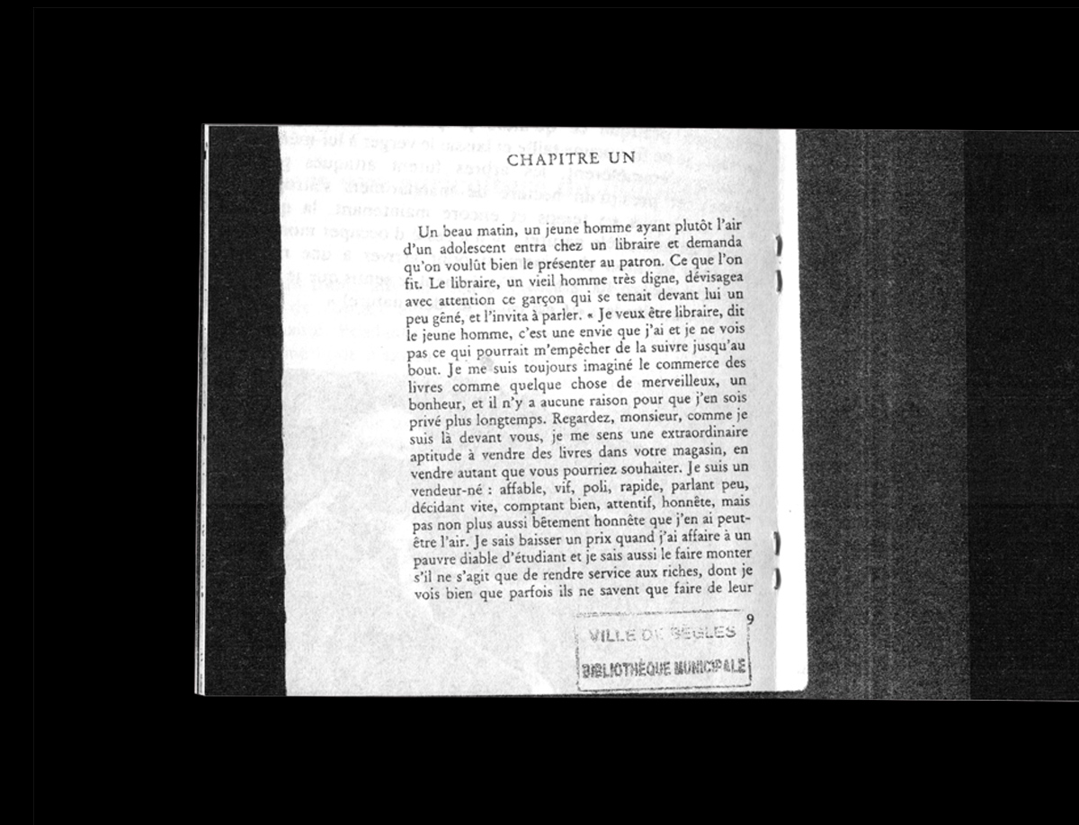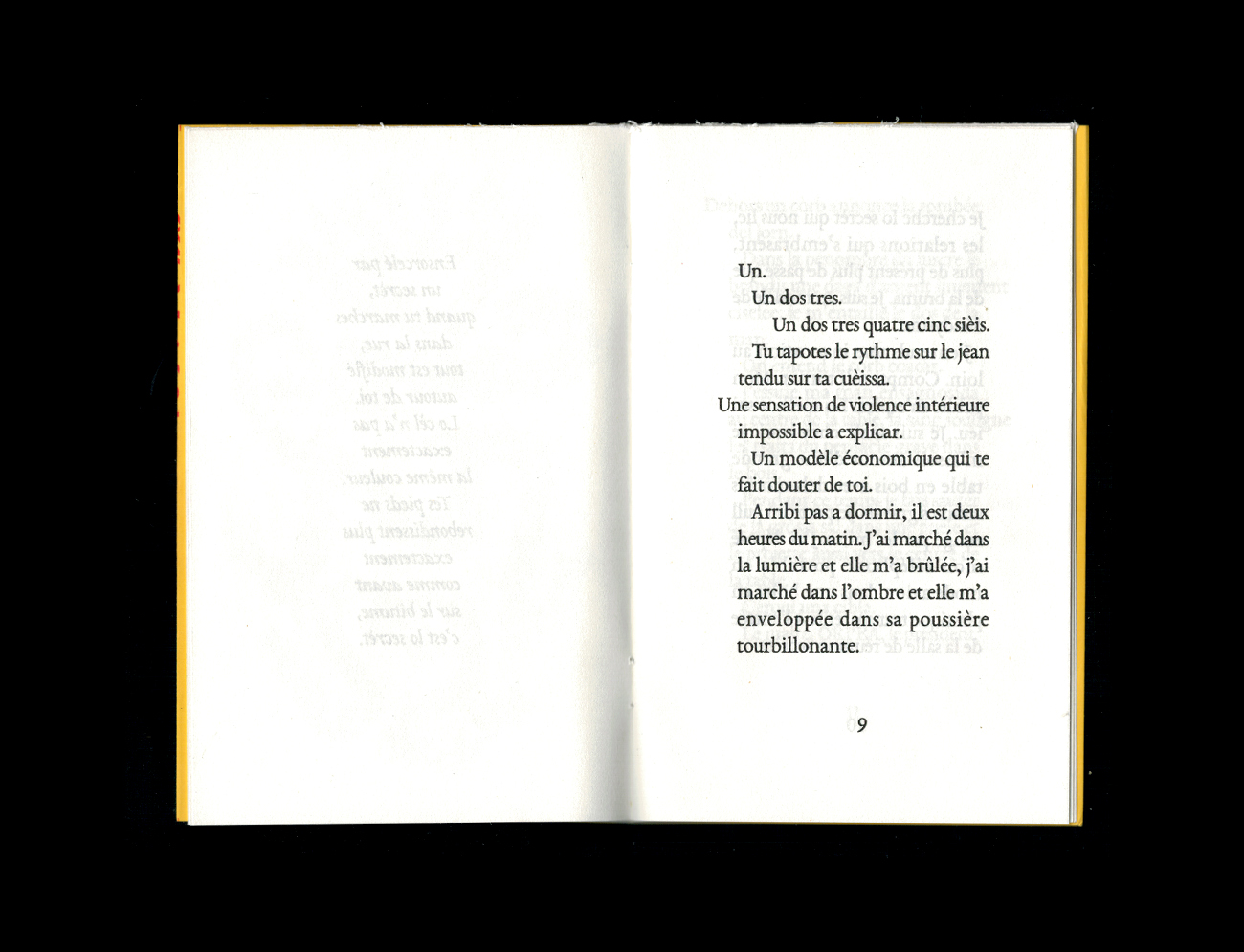 « Des images se superposaient sur différents niveaux, différentes échelles spatiales et temporelles. À chaque fois que j’essayais de m’endormir, tout recommençait. Mon front était incandescent, les gouttes de sueur tombaient en cascade un peu partout sur mon corps décharné, mes yeux pesaient cent kilos et elle m’attendait. C’était une statue, un syndicat, un objectif inaccessible, une fleur. Il me semblait qu’elle me protégeait d’une force plus grande encore, plus sombre aussi, quelque chose de l’ordre d’une attaque du grand capital, un crack boursier ou une bulle financière. Sur un carton publicitaire, sa silhouette prédécoupée dominait une foule attentive. »