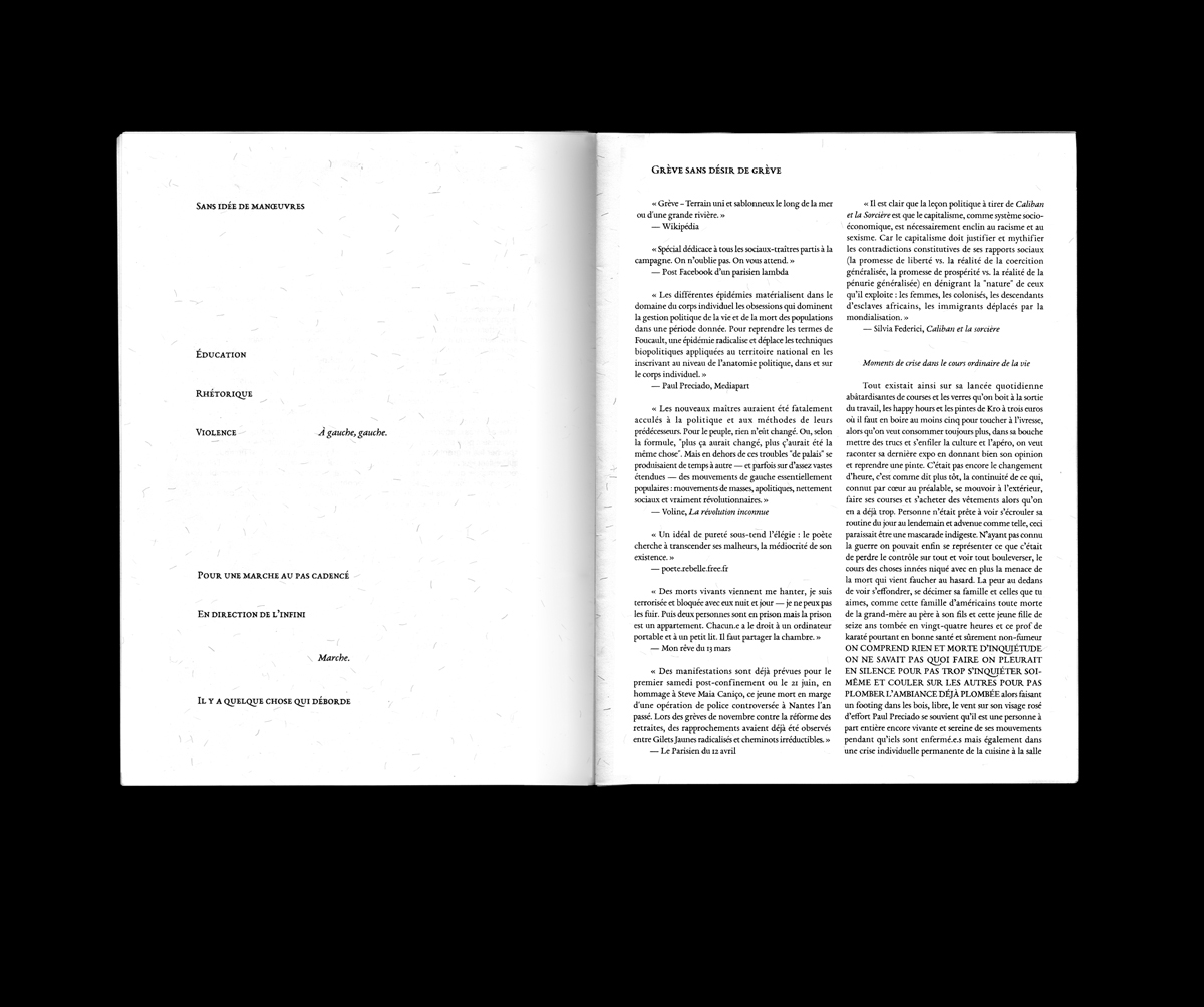 Avec (par ordre d'apparition) : Théo Robine-Langlois, Aron Barbier, Morgane Brien Hamdane, Lulma Guit, Thelma Cappello, Harilay Rabenjamina, Romane Constant, Mia Brion, Eli Rafanell, Asma Berrouachedi et Théo Casciani, lisant respectivement des textes de Danielle Collobert, Simone Weil, Audre Lorde, Maggie Nelson, Masanobu Fukuoka, Robert Walser, Hélène Bessette, Frank O'Hara, Sylvia Federici & LDS Astronauts, Monique Wittig, André 3000 & Zadie Smith & Virgile.