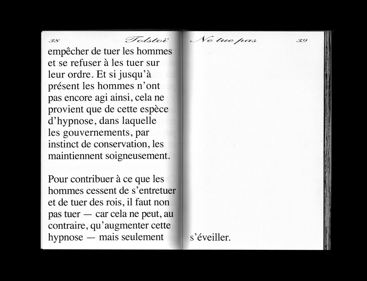 Quand Tolstoï prend la parole en octobre 1900 dans les colonnes des Temps Nouveaux, il réagit à l’assassinat du roi Humbert par l’anarchiste Gaetano Bresci survenu quelques mois plus tôt à Monza, en Italie. Empli des valeurs du Christ et de la mysticité de son anarchisme, ce texte, jamais édité, est un appel à la conscience collective, à l’amour et au refus des valeurs du pouvoir. La seconde moitié du livre reprend un chapitre du manga Vagabond, basé sur les deux romans cultes d’Eiji Yoshikawa (La pierre et le sabre, La parfaite lumière) et la vie du samouraï errant Miyamoto Musashi, emporté par une spirale meurtrière dans sa quête spirituelle et philosophique. L’école des Deux Sabres interroge la léthargie généralisée et l’égarement théorique face à la médiocrité des doctrines politique contemporaines. La question soulevée ici est celle de l’équilibre des forces.