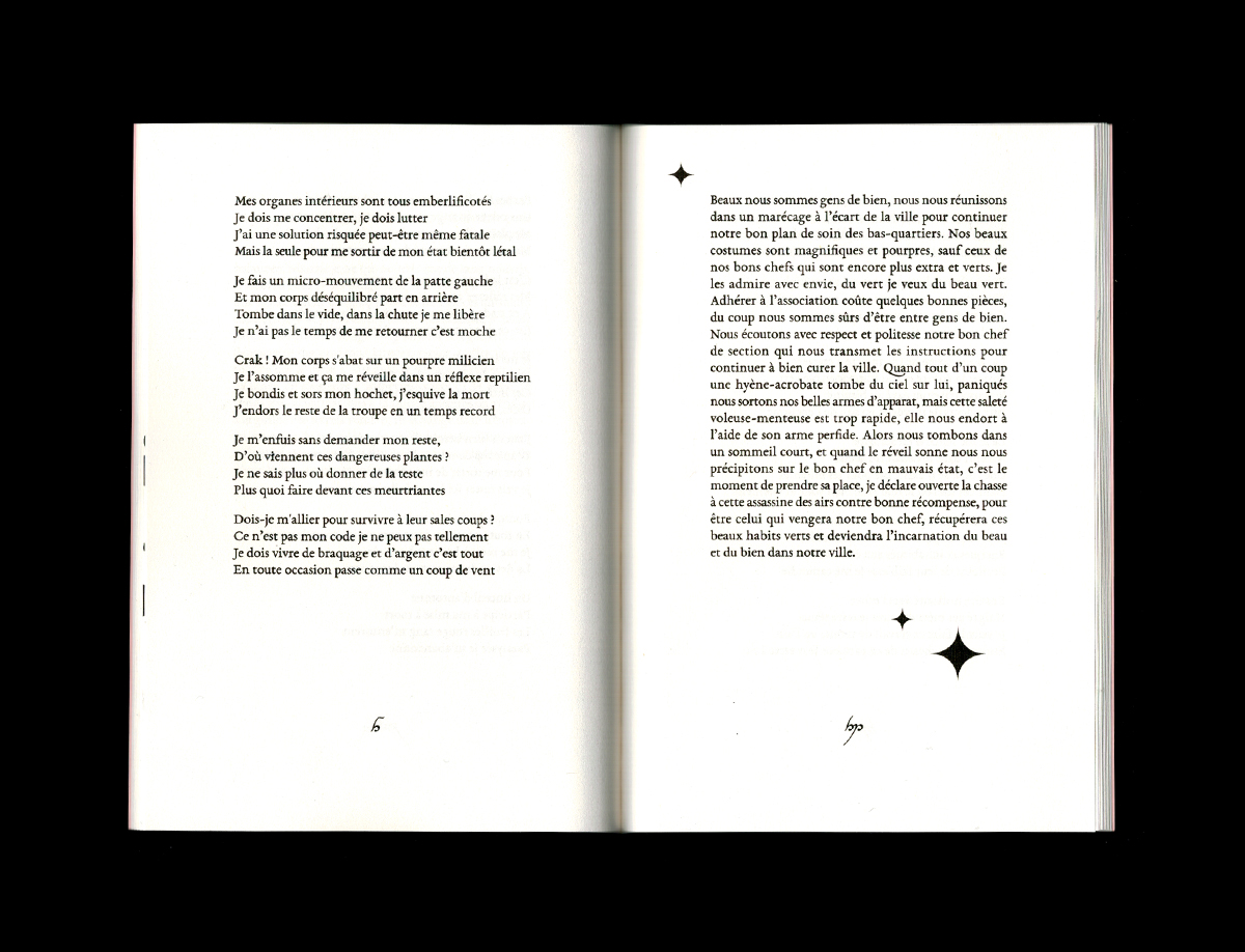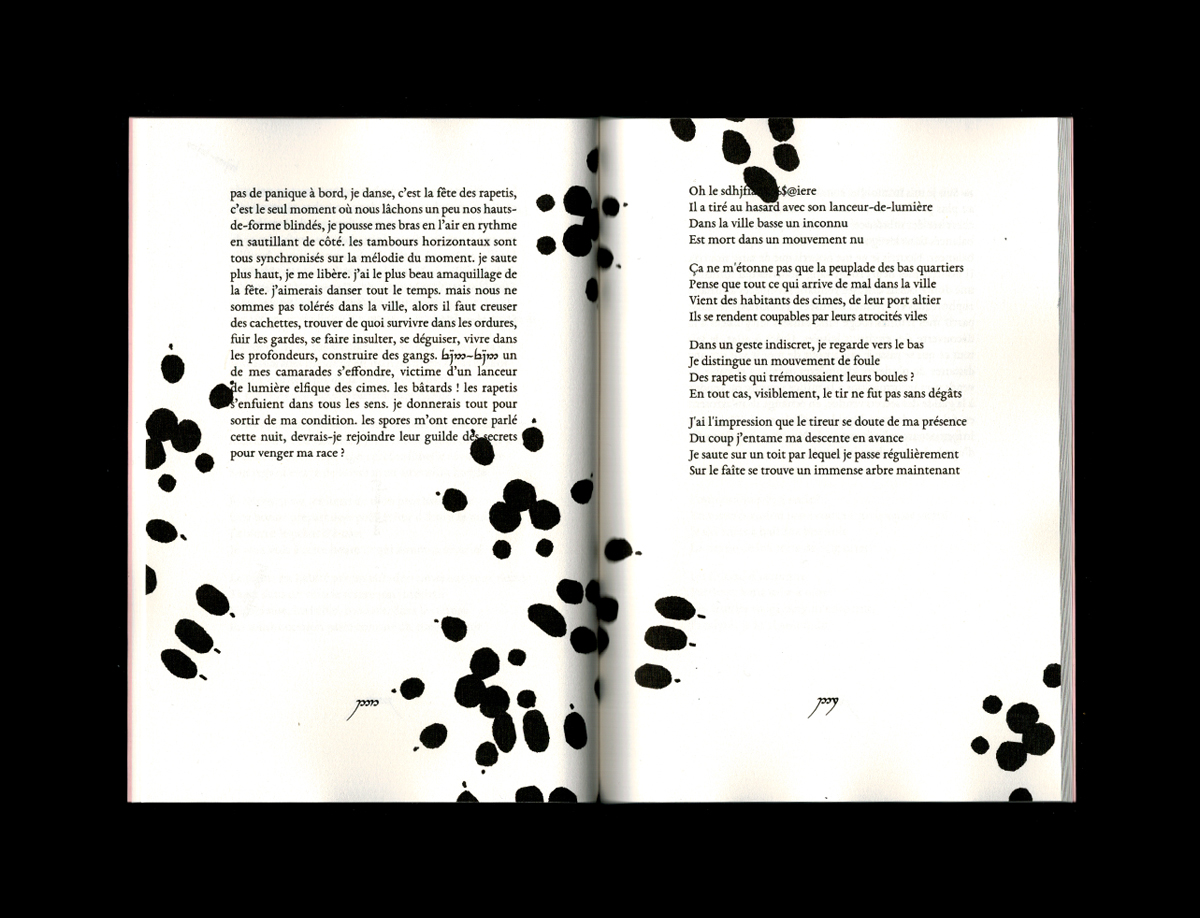 D’inspiration antique et médiévale – autant qu’extraterrestre –, Le Plaisir d’un casse… est traversé par un humour candide et une audace réjouissante face aux formes du passé. La contrainte, ici celle du vers, incite à l’originalité. Comme les langues semi-inventées, les rimes forcées appellent à la création de mots nouveaux, d’une nouvelle orthographe détournée du français standard, qui évoque et actualise celle du néo-français initiée par Raymond Queneau au milieu du siècle dernier. Car c’est aussi un texte franchement contemporain qui fait la nique aux images d’Epinal et à la noblesse attendue des référents poétiques. D’Aya Nakamura aux néonicotinoïdes ou à la série de jeux vidéo des Baldur’s Gate, Le Plaisir d’un casse… assume l’impertinence et la vernacularité de ses racines. Flanqué, entre autres, d’un sanglier de travail, d’un mutant aux mains de pierre, de champignons mycorhiziens ou bien d’un elfe-des-cimes aux yeux rieurs et aux manières tyranniques, Théo Robine-Langlois se détache des systèmes syntaxiques et linguistiques conventionnels et, en portant à la langue des coups précis, farfelus et formellement nouveaux, tente de la débarrasser du mal despotique qui la ronge.