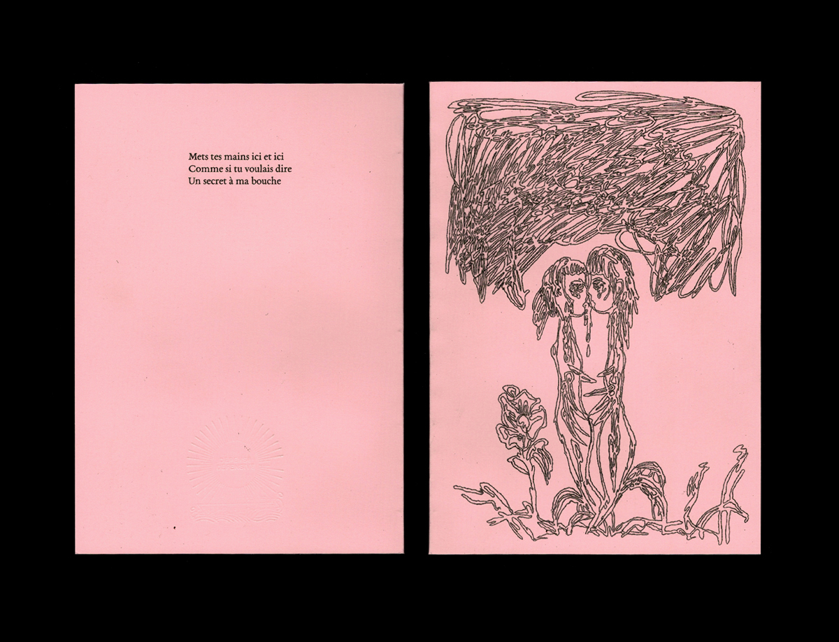 L’artiste Mimosa Echard signe la merveilleuse couverture, ainsi que deux œuvres non moins merveilleuses au début et à la fin du livre. Une strophe du texte avait déjà rejoint son Kombucha Project Center en 2019.