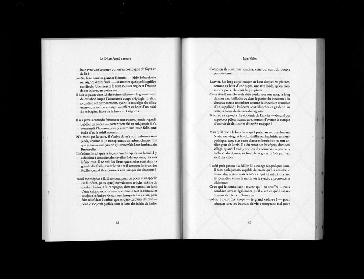 Le Cri du Peuple a reparu est une citation, un fragment des derniers chapitres de L’insurgé de Jules Vallès suivi d’une postface de Laure Godineau sur le rôle de la barricade dans l’œuvre de l’écrivain-communeux. L’ouvrage procède d’une réflexion sur la barricade comme outil de production du peuple insurrectionnel et de ses formes d’existence, notamment dans le Paris du XIXe siècle. Il croise également des recherches plus contemporaines sur le watermark (tatouage numérique en français) et les questions relatives à la dissimulation d’information, à la propriété et à l’anonymat. Une lecture en a été donnée au Cneai en avril 2018.
