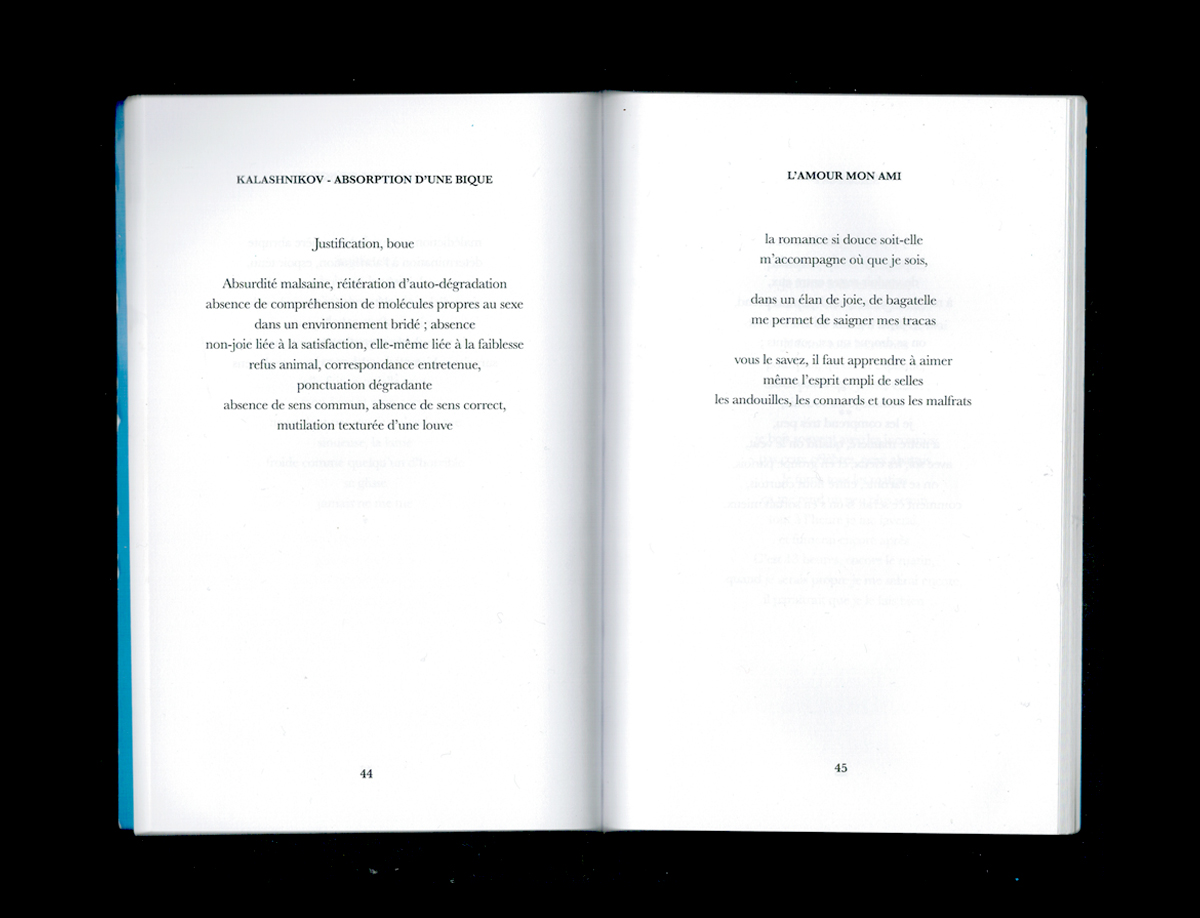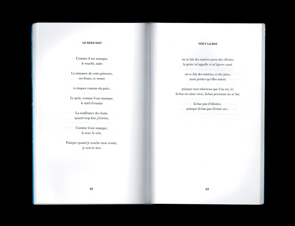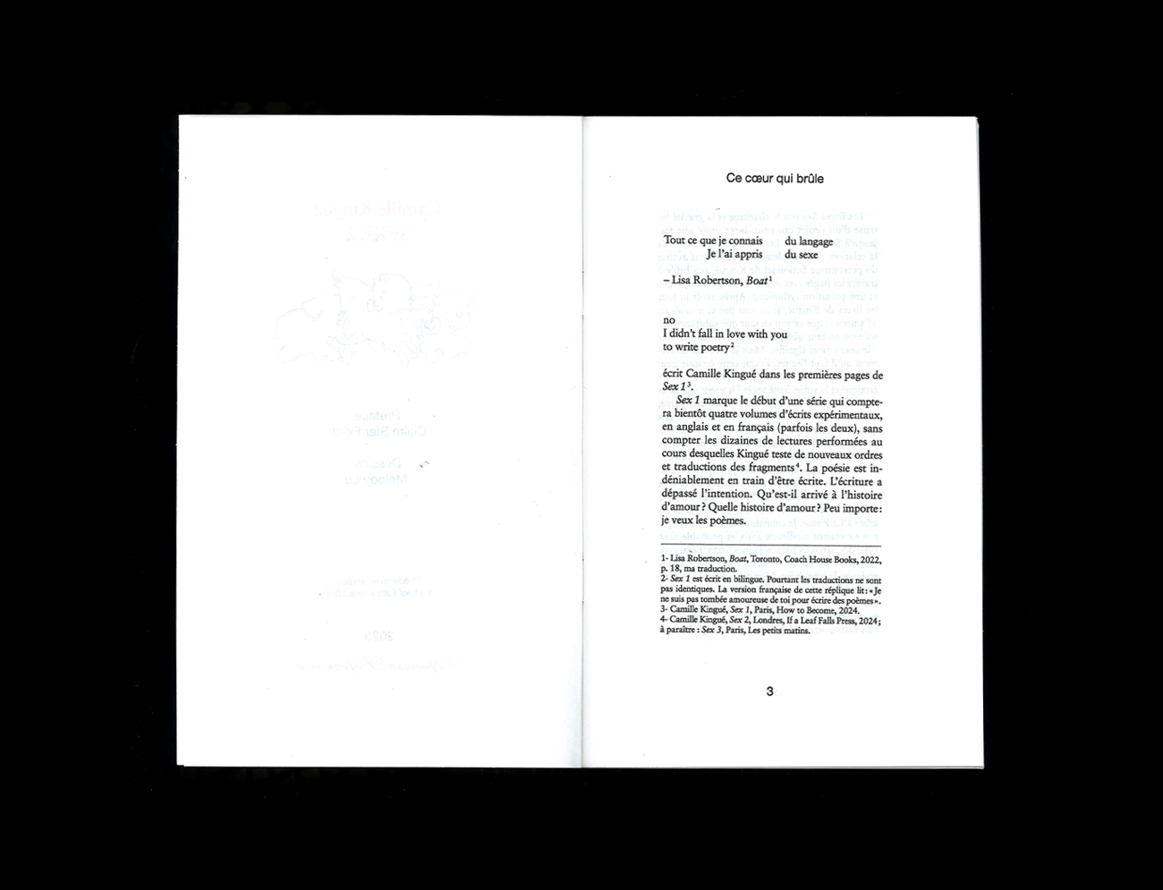 Confession sur le désir (l’action et l’objet du), les liens de mutualité et de résistance, Sexe 2 alterne prose et versification en 27 fragments numérotés à l’adresse plus ou moins dure, plus ou moins sincère, plus ou moins formulée car plus ou moins éloignée du Toi et du Je. Camille Kingué s’attache à révéler, à voir quelque chose à travers son image réelle et virtuelle, agrandie et rétrécie, droite et renversée, déployant une recherche des principes de l’amour (l’amour comme amour, pourquoi est ce qu’il y a de l’amour) où la métaphysique et la compréhension de soi – donc de l’autre – n’ont jamais été aussi sexy. Claire Star Finch, dans la magnifique préface qu’iel signe au début de l’ouvrage, écrit : « Après avoir lu tous les livres de Kingué, je ne sais pas si je crois en “l’amour”, que ce soit en tant que substantif absolu ou en tant que proto-résidu de tout ce que “le sexe” peut signifier. Mais je crois définitivement qu’il faut l’écrire. » Définitivement.
