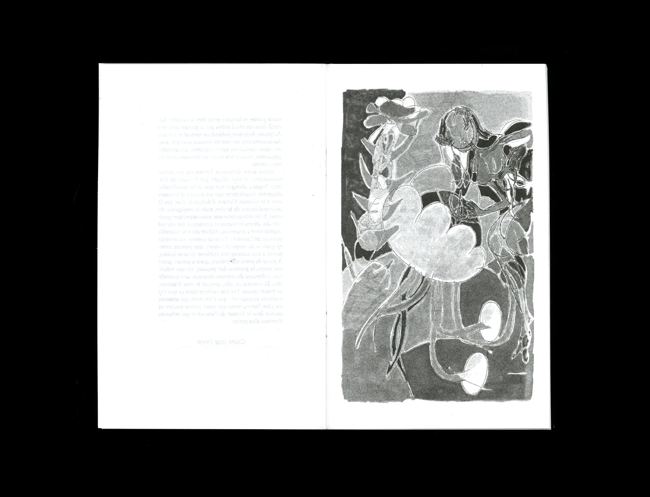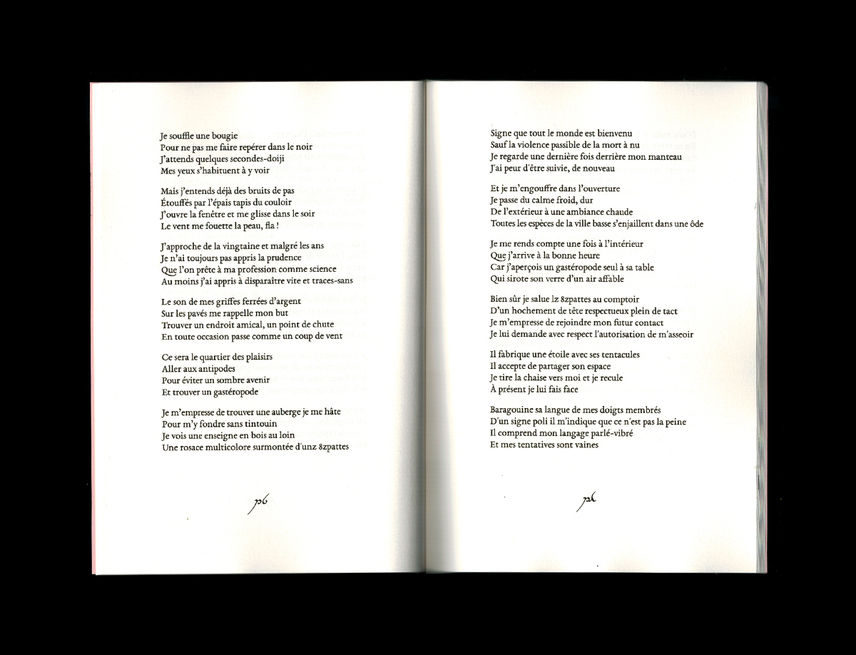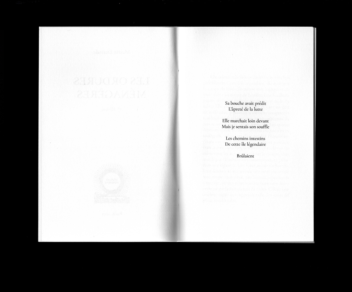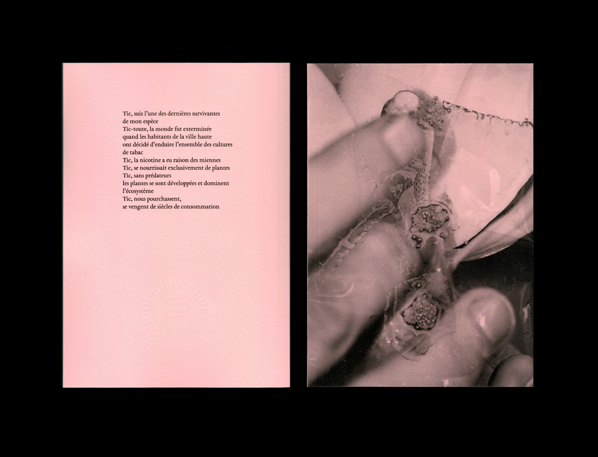 L’artiste Mimosa Echard signe la merveilleuse couverture, ainsi que deux œuvres non moins merveilleuses au début et à la fin du livre. Une strophe du texte avait déjà rejoint son Kombucha Project Center en 2019.