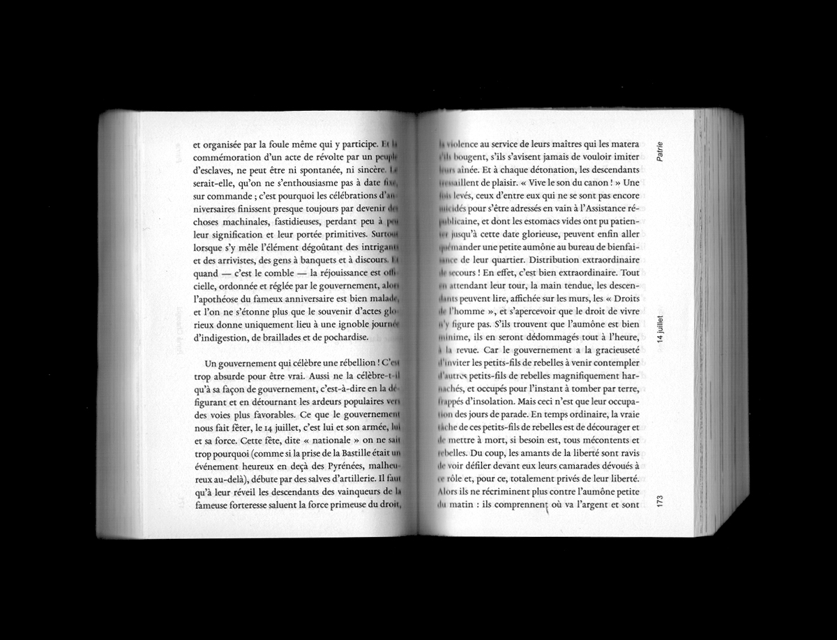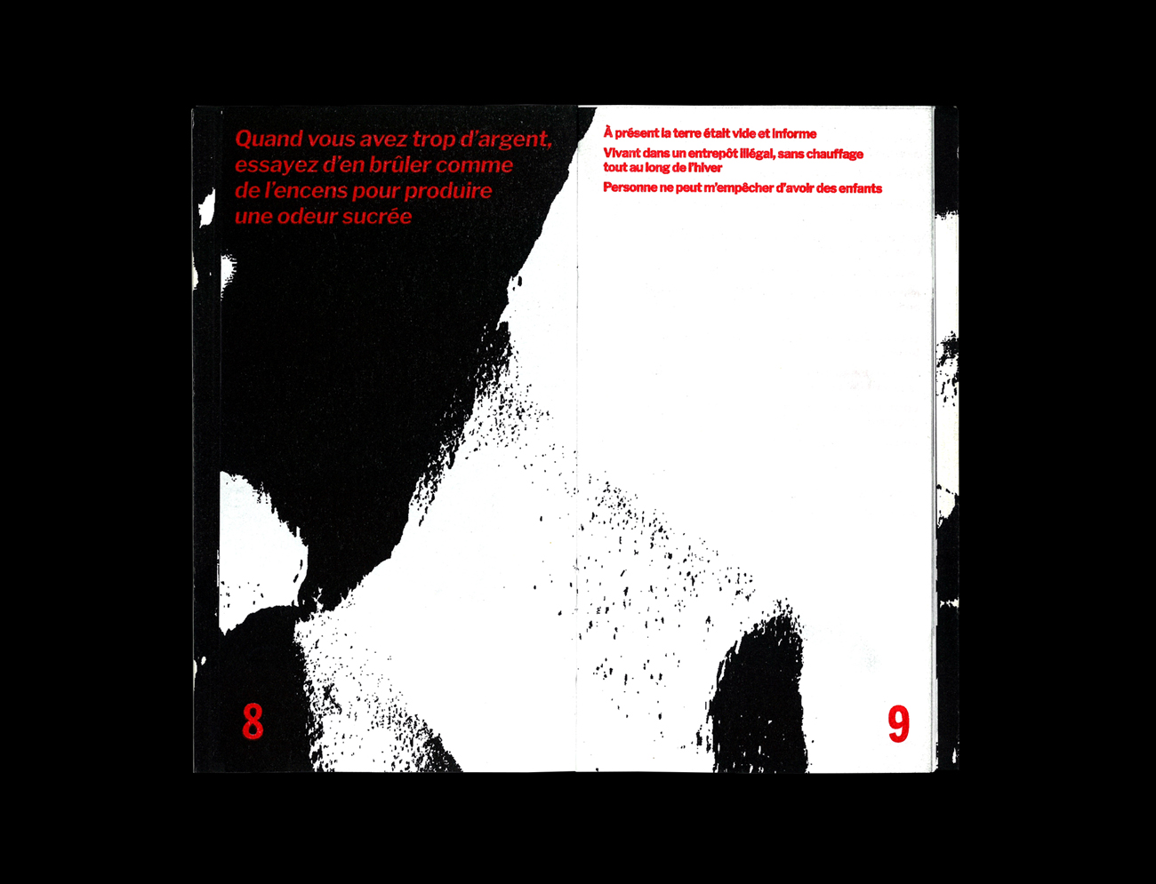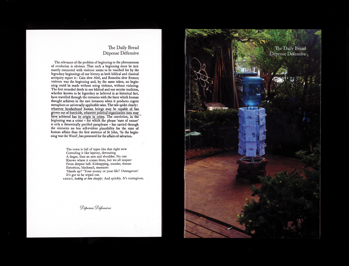 The Daily Bread possède le double statut de recueil de textes et de catalogue d’exposition. L’ouvrage est une archive de la résidence éponyme de Dépense Défensive qui se déroula du 2 au 17 août 2018 au Petit Versailles à New York, en même temps que la matière principale de son contenu. Le premier chapitre d’un livre y était publié, lu et discuté chaque jour. En tout quinze ouvertures, quinze préludes, comme une collection de commencements, un catalogue raisonné de subjectivités. Les quinze premiers chapitres sont reproduits ici accompagnés d’images documentant les performances et les installations, ainsi que de nombreuses photographies « hors-les-murs ».