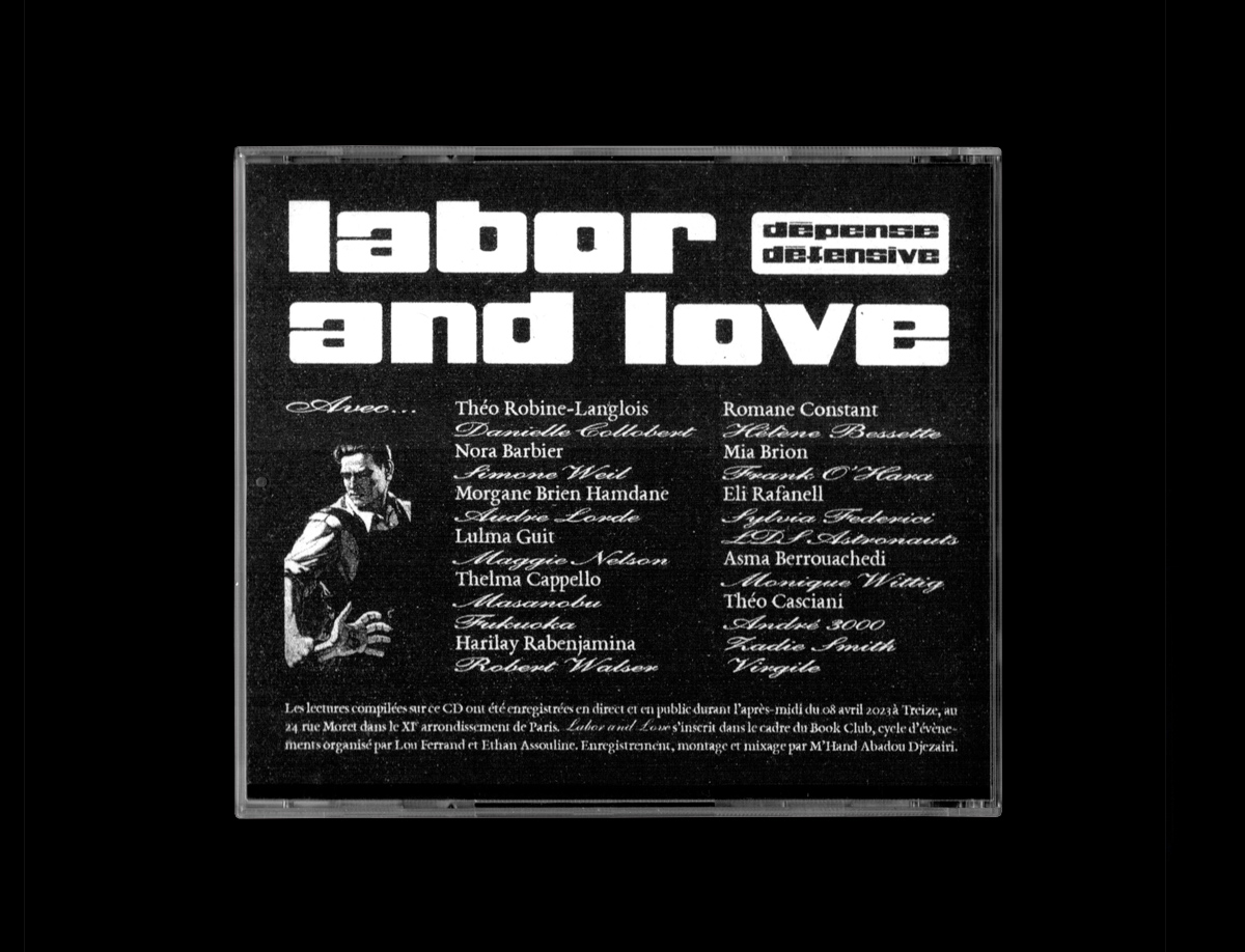Dans le cadre du Book Club, cycle d'événements organisé par Lou Ferrand et Ethan Assouline, une série de lectures et d'enregistrements ouverts au public se sont déroulés le 8 avril 2023 à Treize, au 24 rue Moret à Paris. Pour penser (en quelque sorte) les frontières et les porosités qui procèdaient des deux propositions du titre Labor and Love et y réfléchir collectivement lors de cette période d'ignobles lois et de répression, onze personnes ont été invitées à choisir un texte (poésies, essais, articles, correspondances, w/e they want) qui pouvait très librement traiter du travail ou de l’amour ou des deux, en ne dépassant pas cinq (en quelque sorte) minutes de long. Réflexions sur la condition tant amoureuse que laborieuse ou humaine, les lectures, compilées ici sur un CD, sont accompagnées d'un booklet de 24 pages imprimé en riso.