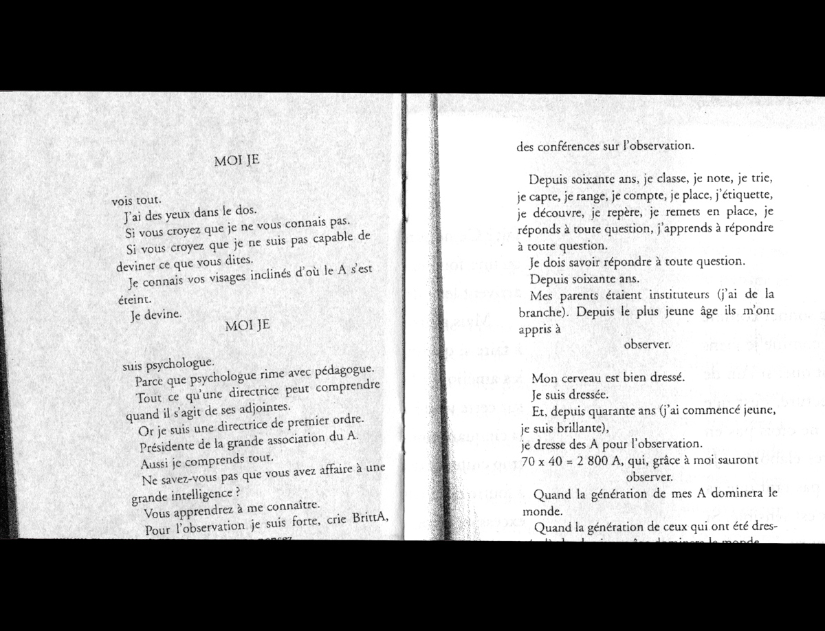 LA REINE Je ne serai donc jamais qui je suis ? L'ENVOYÉ Jamais plus. LA REINE Chaque évènement de ma vie : mon sang qui perle si je m'égratigne... L'ENVOYÉ Tout s'écrira pour vous avec une majuscule. LA REINE Mais c'est la Mort ? L'ENVOYÉ C'est Elle.