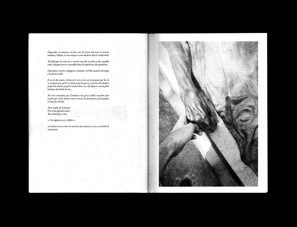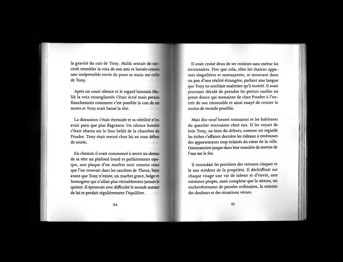« Dégueuler ces fratries, ces faux airs de frères d’armes, le racisme ambiant, l’idiotie, le sens unique et cette douleur dans le mollet droit. Terrifiés par les mots ils se terrent sous des muscles et des coquilles vides, des pansements camouflés dans la répétition des opérations. »