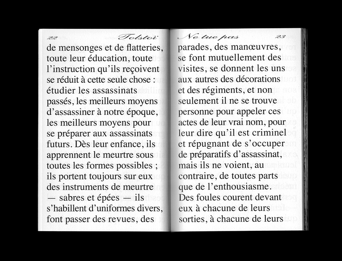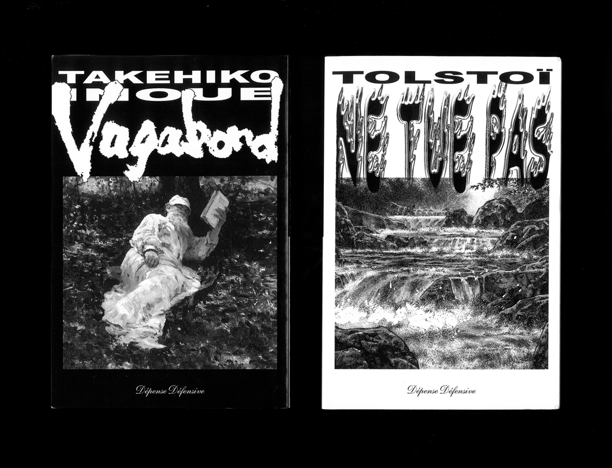 Quand Tolstoï prend la parole en octobre 1900 dans les colonnes des Temps Nouveaux, il réagit à l’assassinat du roi Humbert par l’anarchiste Gaetano Bresci survenu quelques mois plus tôt à Monza, en Italie. Empli des valeurs du Christ et de la mysticité de son anarchisme, ce texte, jamais édité, est un appel à la conscience collective, à l’amour et au refus des valeurs du pouvoir. La seconde moitié du livre reprend un chapitre du manga Vagabond, basé sur les deux romans cultes d’Eiji Yoshikawa (La pierre et le sabre, La parfaite lumière) et la vie du samouraï errant Miyamoto Musashi, emporté par une spirale meurtrière dans sa quête spirituelle et philosophique. L’école des Deux Sabres interroge la léthargie généralisée et l’égarement théorique face à la médiocrité des doctrines politique contemporaines. La question soulevée ici est celle de l’équilibre des forces.