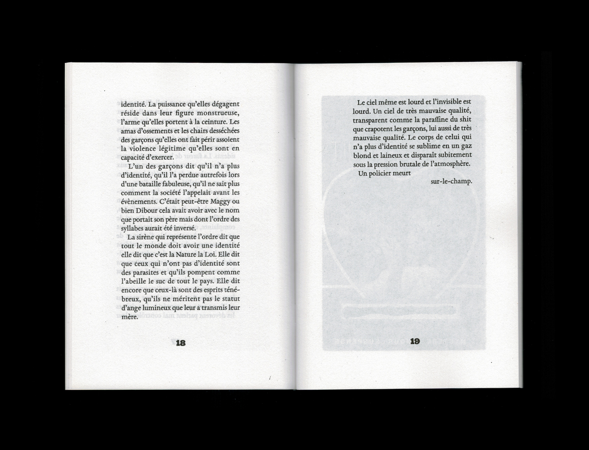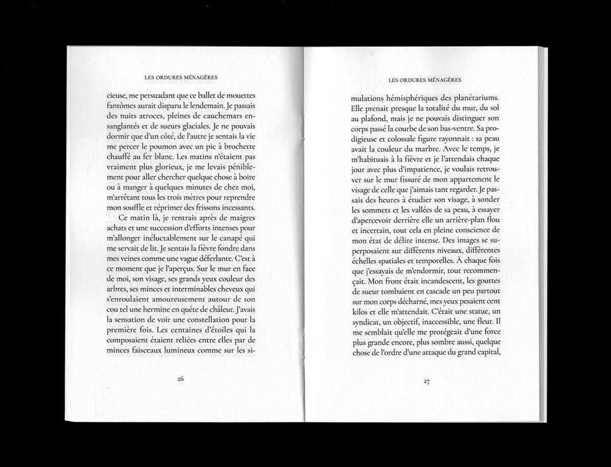 « Des images se superposaient sur différents niveaux, différentes échelles spatiales et temporelles. À chaque fois que j’essayais de m’endormir, tout recommençait. Mon front était incandescent, les gouttes de sueur tombaient en cascade un peu partout sur mon corps décharné, mes yeux pesaient cent kilos et elle m’attendait. C’était une statue, un syndicat, un objectif inaccessible, une fleur. Il me semblait qu’elle me protégeait d’une force plus grande encore, plus sombre aussi, quelque chose de l’ordre d’une attaque du grand capital, un crack boursier ou une bulle financière. Sur un carton publicitaire, sa silhouette prédécoupée dominait une foule attentive. »