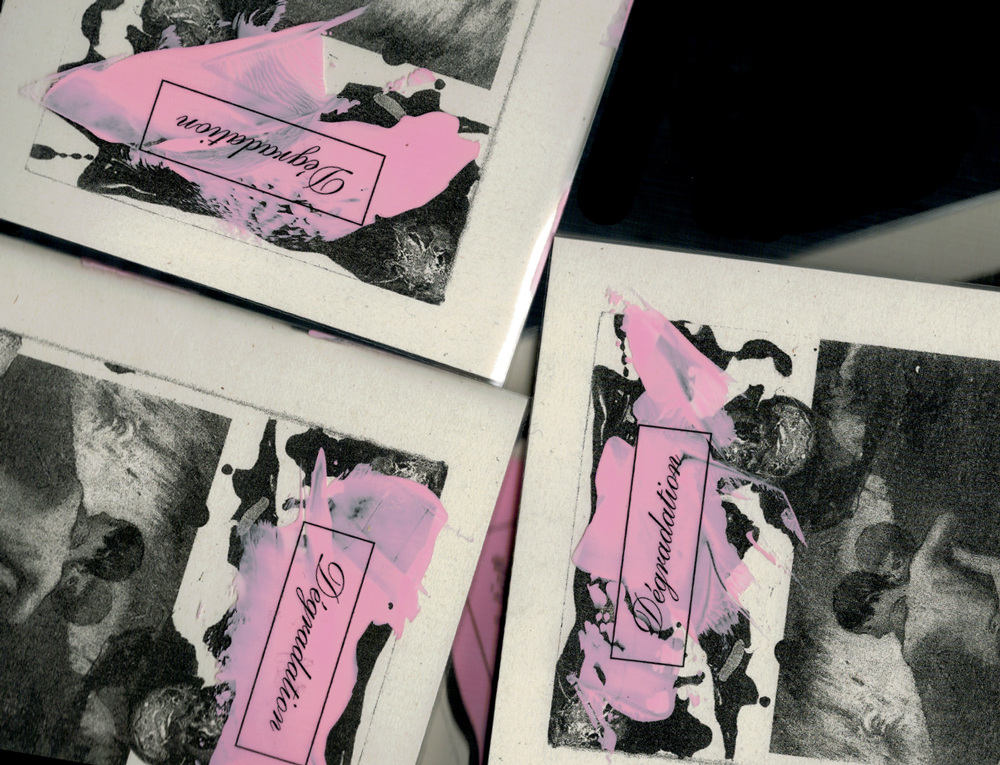 Dégradation est une large poème en prose qui traite d'affection, d'exclusion, de la destruction comme acte créateur. Esquissant les contours d'une masculinité avant la toxicité, l'auteur y exalte un grand sentiment collectif et tente de repenser un temps circulaire, sans avant ni après. Le texte, composé de dix scénettes, est accompagné de reproductions de treize peintures de Louis Somveille réalisées sur des couvertures de livres de poche, ainsi que d'une jaquette unique peinte à la main par l'artiste.