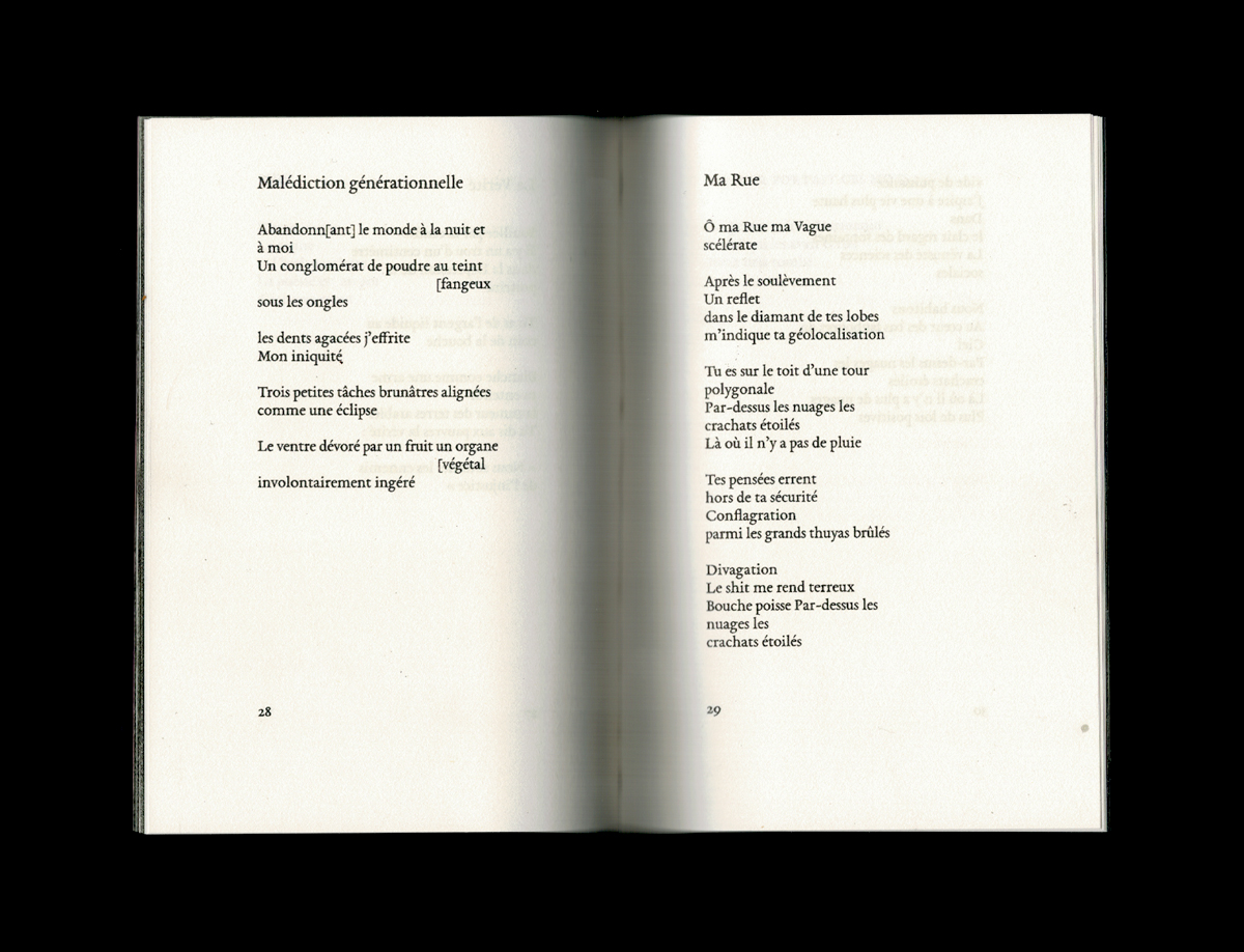 Né en 1990, Théo Robine-Langlois explore le langage au travers de différents supports d’écriture, comme l’écran, le livre, la radio ou internet avec les sites demainjarretepas.net et dontforgetyourbodyinthebubble.net. Son dernier livre, Le Gabion, édité par After 8 Books, a paru en 2021.