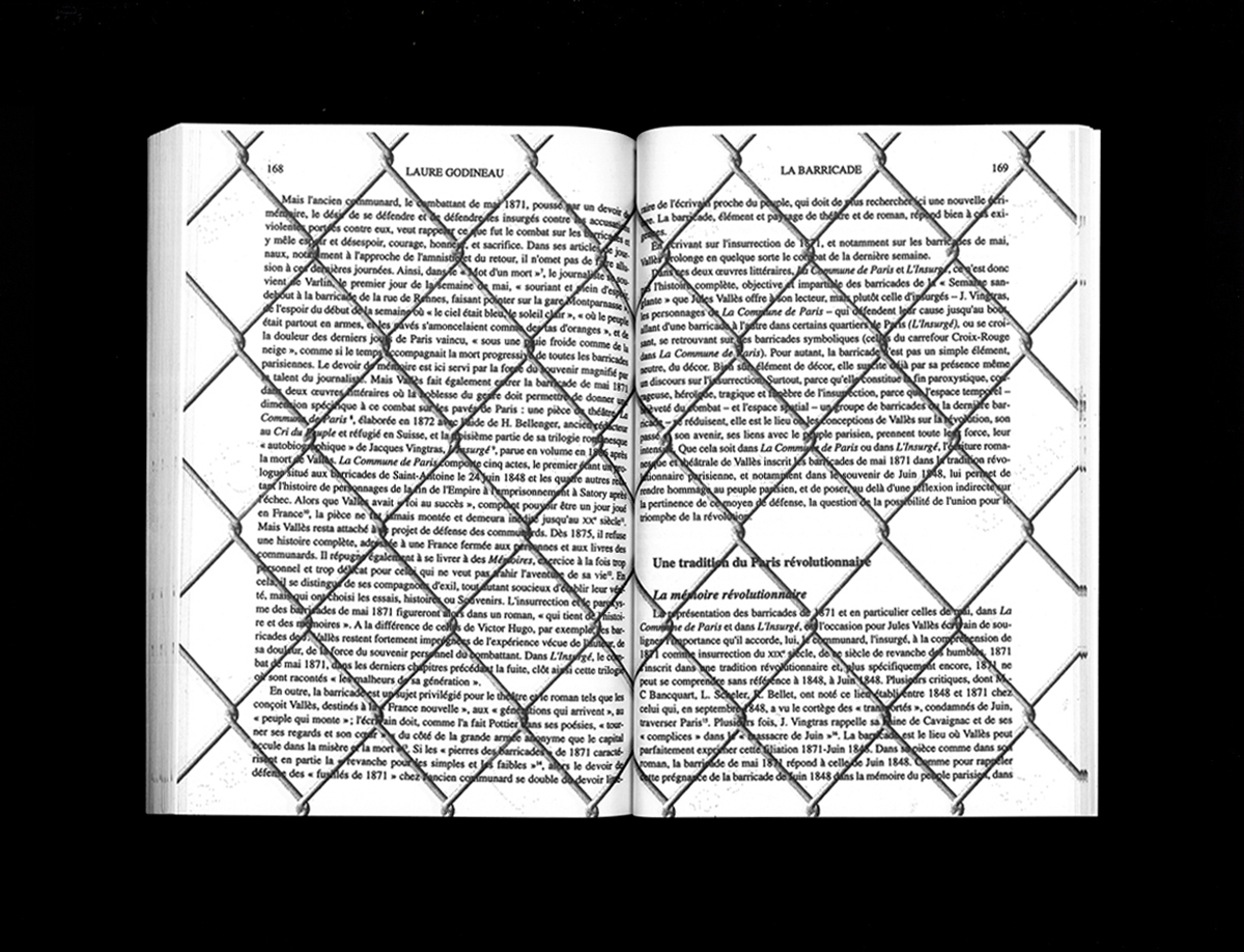 Le Cri du Peuple a reparu est une citation, un fragment des derniers chapitres de L’insurgé de Jules Vallès suivi d’une postface de Laure Godineau sur le rôle de la barricade dans l’œuvre de l’écrivain-communeux. L’ouvrage procède d’une réflexion sur la barricade comme outil de production du peuple insurrectionnel et de ses formes d’existence, notamment dans le Paris du XIXe siècle. Il croise également des recherches plus contemporaines sur le watermark (tatouage numérique en français) et les questions relatives à la dissimulation d’information, à la propriété et à l’anonymat. Une lecture en a été donnée au Cneai en avril 2018.